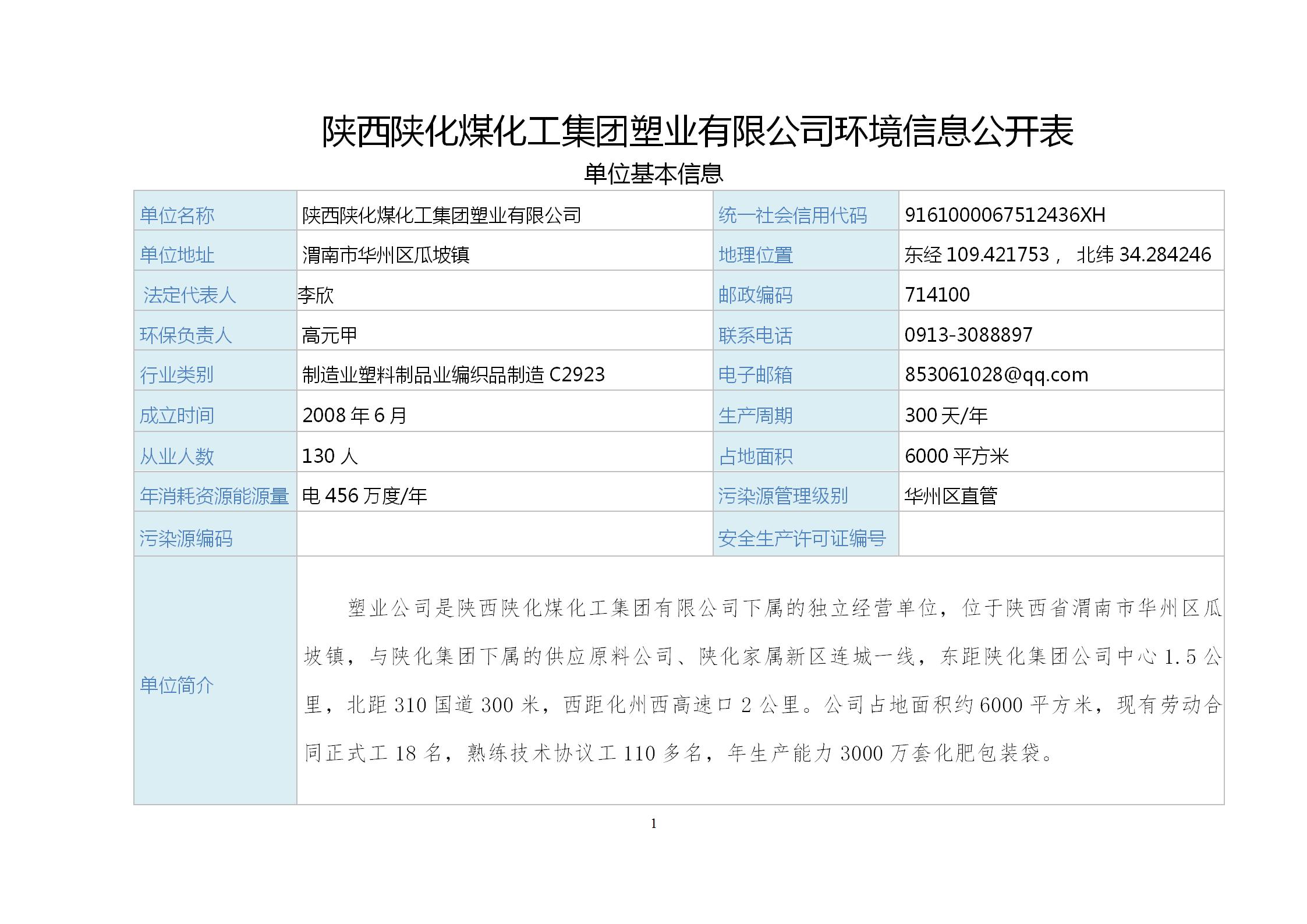 陕西陕化煤化工emc网页版登录塑业公司环境信息公开表